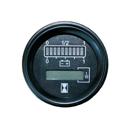 它主要由一塊液晶小時計儀表及十個電量狀態(tài)指示LED組成。液晶小時計儀表主要積累顯示車輛工作小時,十個狀態(tài)LED指示當(dāng)前蓄電池的剩余電量。